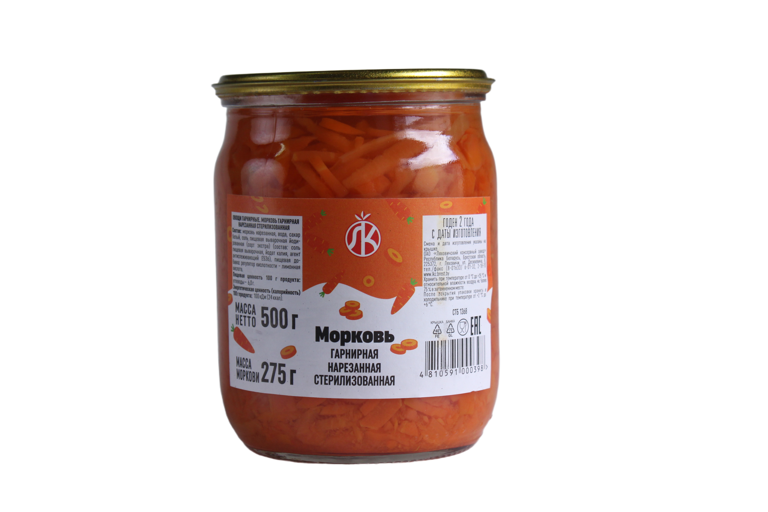 Морковь гарнирная нарезанная стерилизованная (500 г) — это натуральные овощные консервы, которые производятся в Беларуси, в частности ОАО «Ляховичский консервный завод» (Брестская область). Продукт представляет собой отварную морковь, полностью готовую к употреблению.