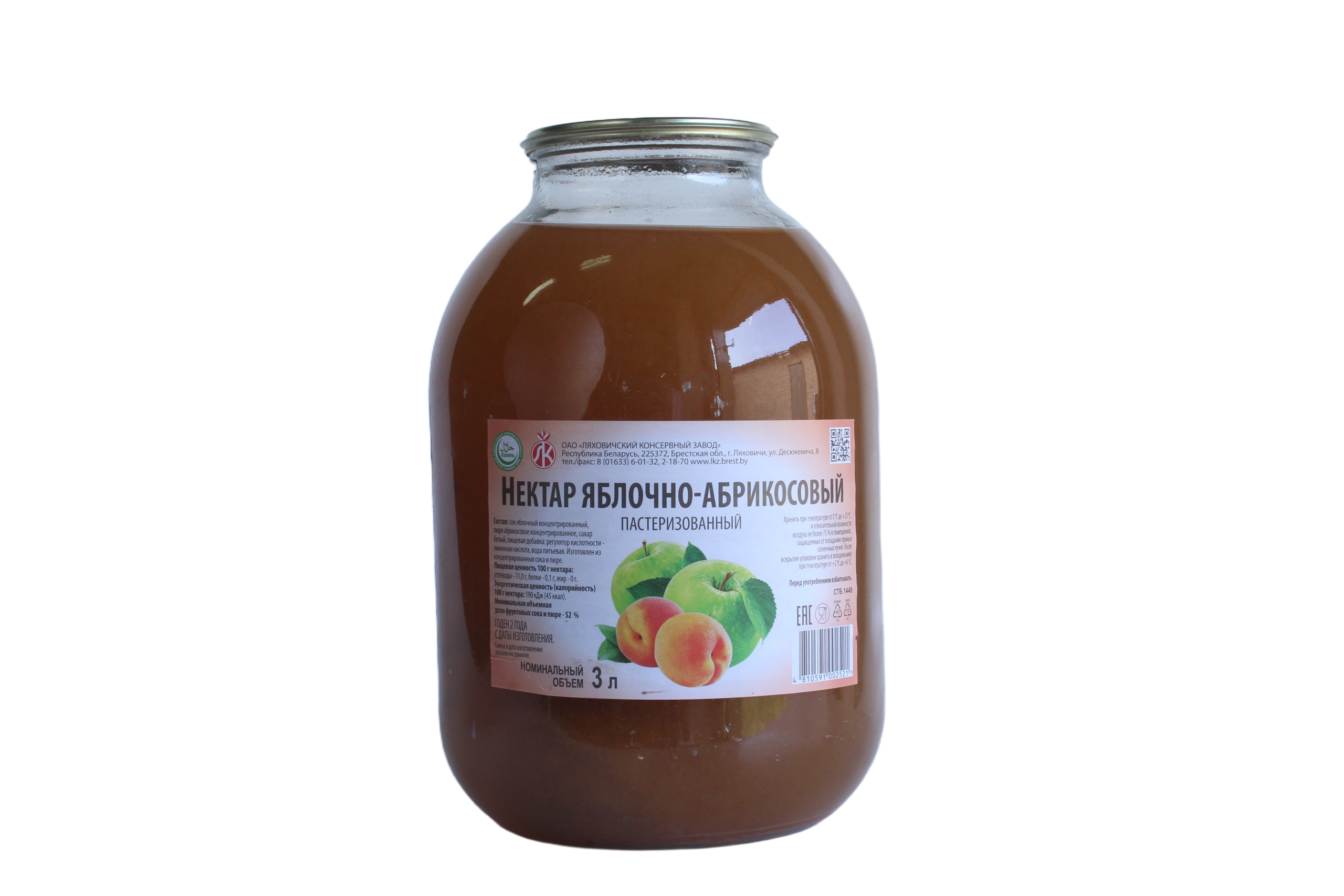 Нектар яблочно-абрикосовый восстановленный пастеризованный (3000 мл) — это густой фруктовый напиток от ОАО «Ляховичский консервный завод» (Беларусь), который отличается бархатистой текстурой и нежным вкусом спелых абрикосов.