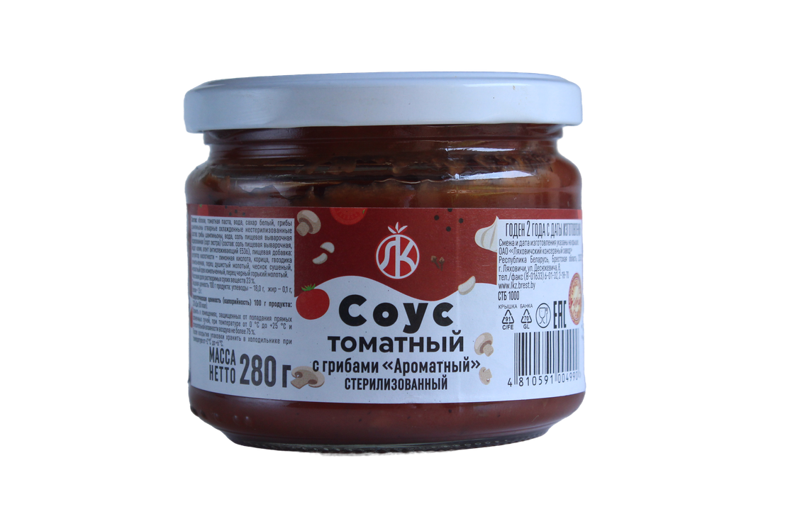 Соус томатный «Ароматный» с грибами в фасовке 280 г — это стерилизованный продукт, выпускаемый белорусским производителем ОАО «Ляховичский консервный завод».