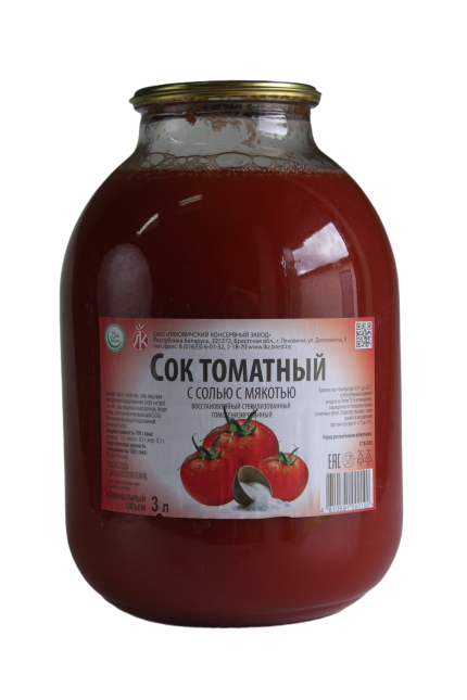 Сок томатный с солью и мякотью восстановленный (3000 г) — это натуральный напиток от ОАО «Ляховичский консервный завод» (Беларусь), произведенный